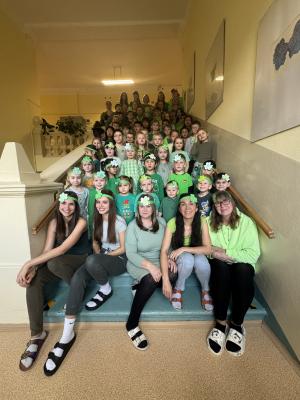 Dnes se naše škola proměnila v zelené moře. V rámci oslav svátku svatého Patrika přišli žáci i učitelé oblečeni do různých odstínů zelené – od triček a mikin přes čelenky až po žabí a skřítkovské kostýmy.