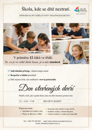 Vážení rodiče, přátelé školy. Dovolujeme si Vás tímto srdečně pozvat na den otevřených dveří, který se bude konat dne 22.01.2026 od 14:30 do 17:00 hod. Těšíme se na Vás!