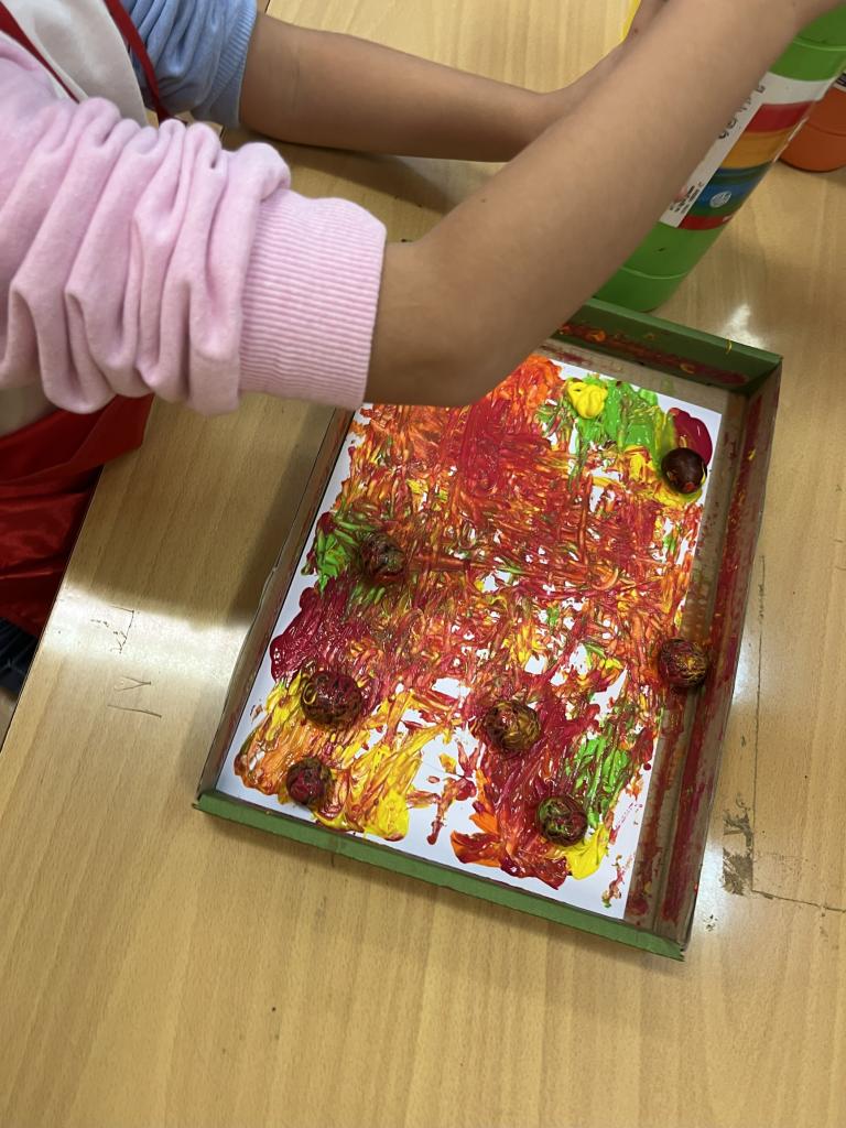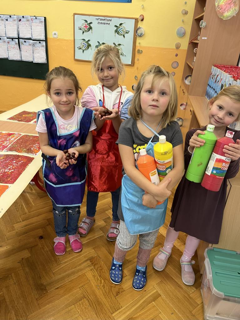 Podívejte se na naši hodinu pracovních činností, ve které jsme malovali kaštany a podzimní listy technikou "HRK-HRK".